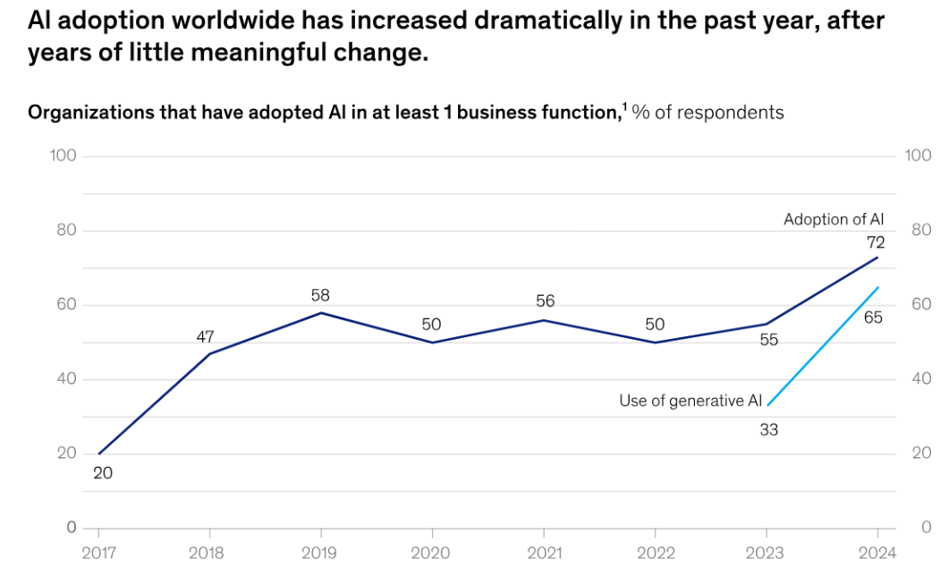 Recent studies indicate a growing interest in AI among SMEs. According to McKinsey's 2024 report, AI adoption has surged globally, with 72% of organisations implementing AI in some capacity, a significant increase from previous years.